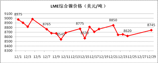 對于來年1月份走勢判斷,從技術(shù)面看,倫鎳在未站穩(wěn)8800美元/噸以上時,市場仍舊存在下跌至8100美元/噸一線的風(fēng)險,甚至存在創(chuàng)新低的可能。從基本面看,倫鎳庫存依舊高位,表面看市場供應(yīng)繼續(xù)充足,但從中國進口精煉鎳、鎳鐵的量來看,并未呈現(xiàn)繼續(xù)增加的態(tài)勢,可見實際國外供應(yīng)量已基本接近現(xiàn)有峰值,國內(nèi)將進入去庫存化周期,對于鎳市短期而言弱勢盤整是主流。